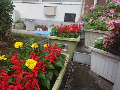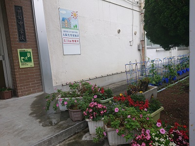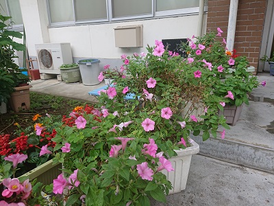 玄関の様子です。玄関前には「戸田花の会」の皆様からいただいたペチュニアやベコニア等がきれいに咲いています。