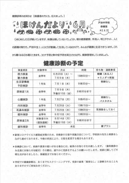 本日、「ほけんだより6月号」を配付しました。健康診断の予定について紹介してあります。