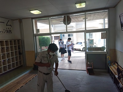 用務員さんが児童生徒の登校に合わせ、校内環境整備に努めています。