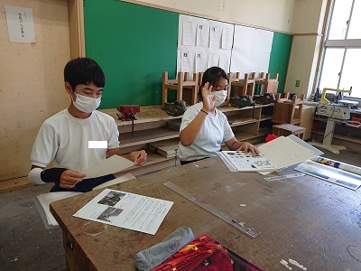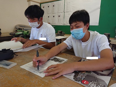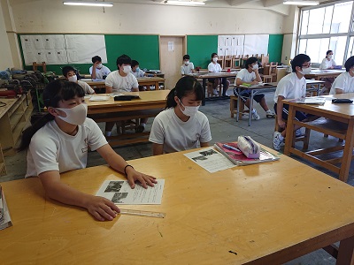 3年生は美術で「空想の世界への誘い」について学習しています。線遠近法を使って、l課題を描き表そうとしていました。