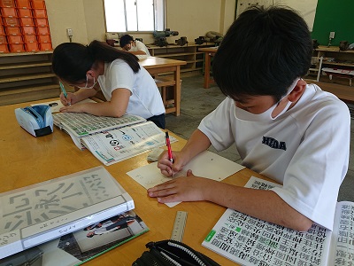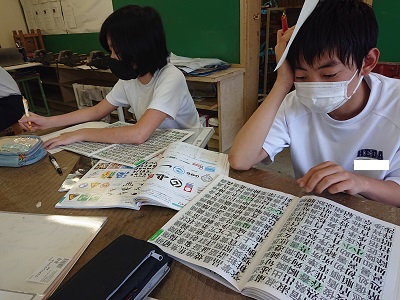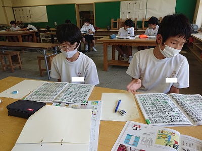 1年生は美術で「楽しく伝える文字のデザイン」という教材を学習しています。漢字一字を言葉のイメージを考えながらデザインしました。