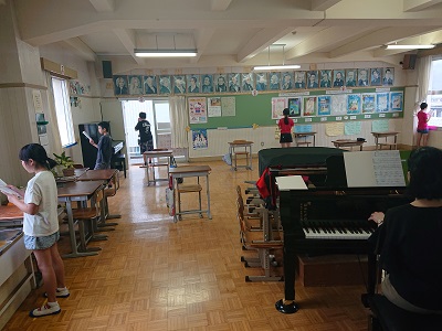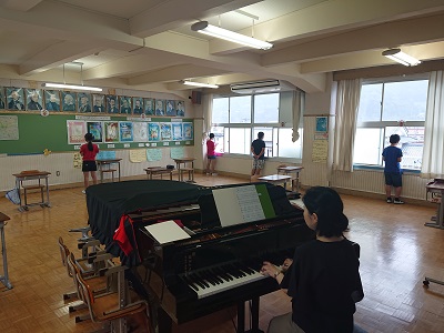 6年生の音楽を小針先生が指導しています。合唱練習は、新型コロナウイルス感染症対策として、それぞれが間隔を十分とり、窓際に立っている子は外に向かって歌っています。