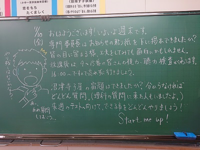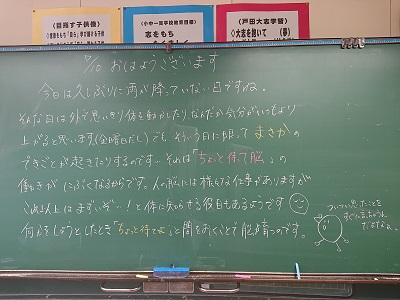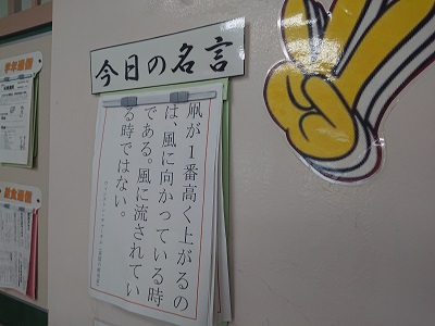 各クラスには、学級担任が思いを込めて用意した「黒板メッセージや今日の名言」が掲げられています。