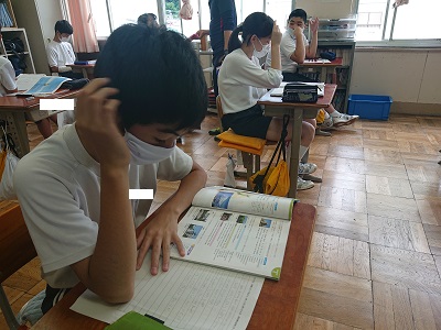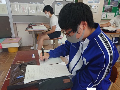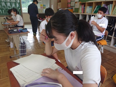 3年生は潮風タイムにおいて、本日の授業で行う英語での日本紹介について文章の原稿チェック、暗誦を行っていました。