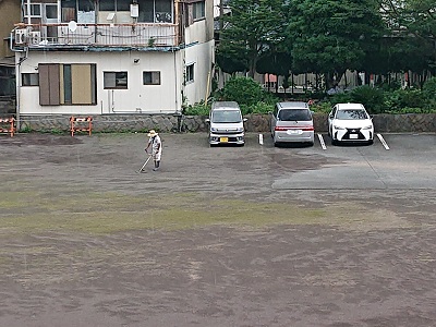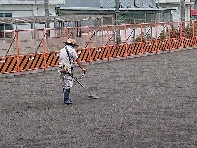 用務員さんが校内環境整備として、グラウンドの草刈りを行っています。