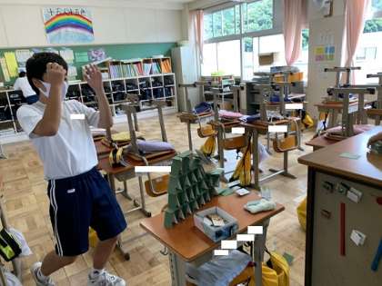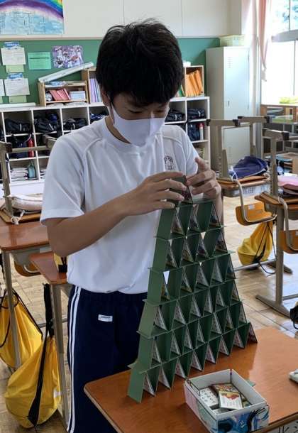 2年生の教室です。昼休みのトランプタワーならぬ百人一首タワーを高く積み上げていました。