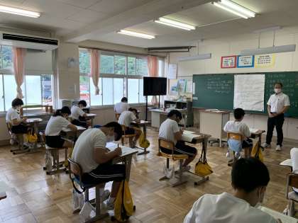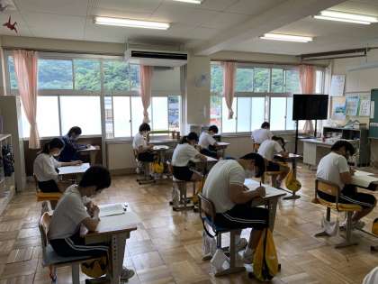本日は一学期末テスト(5教科)を実施しています。3年生が集中してテストに向かっています。