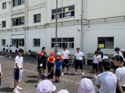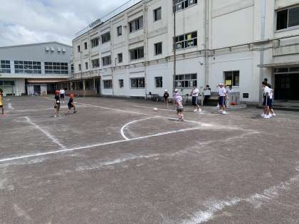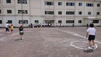 小・中3年生が「自治会遊びデー」でキックベースを楽しんでいます。