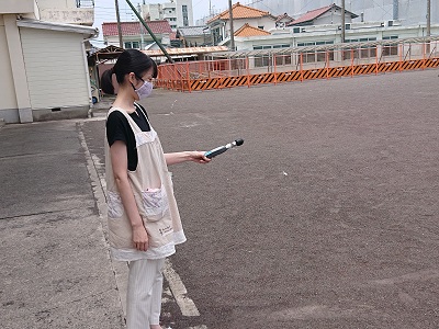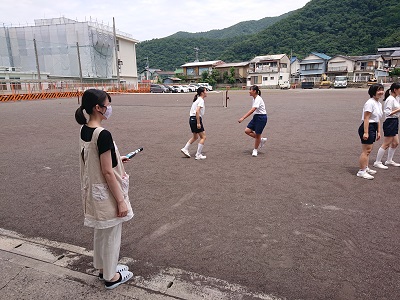 養護教諭が、WBGT(暑さ指数)の測定を行っています。朝から温度は上昇しています。3年生の体育の前にグラウンド状況を確認をしました。