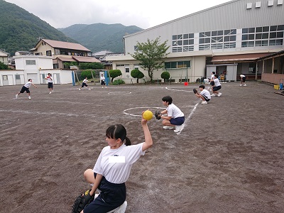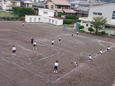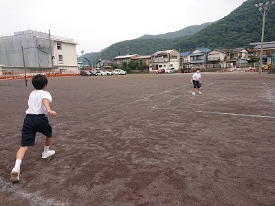 1年生は体育でベースボール型の学習を行っています。ペアでキャッチボールを行っていました。