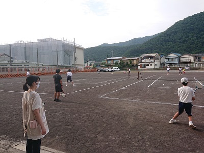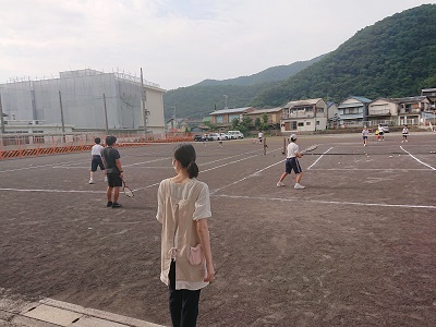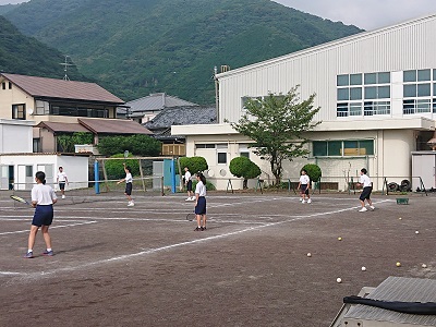 養護教諭が、WBGT(暑さ指数)の測定を行っています。グラウンドでは、ソフトテニス部の生徒が元気に活動しています。