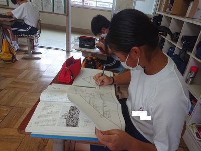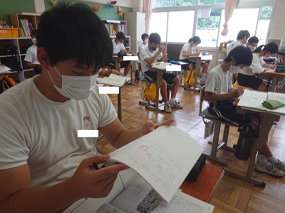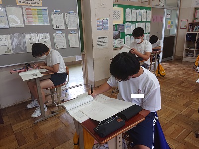 3年生は国語で「黒い雨 井伏鱒二著」を学習しています。作者は「黒い雨」を通して、何を伝えたかったのかについて、思考ツール(ピラミッドチャート)を使って考えました。
