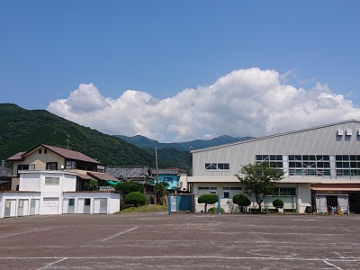校舎付近の様子です。梅雨明けした中学校上空は青空が広がっています。