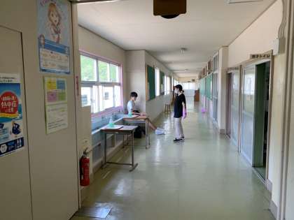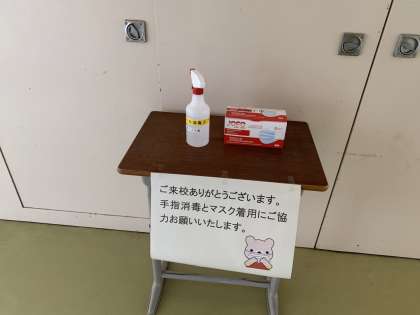 各階には、養護教諭の準備した手指消毒スプレーやマスクが置いてあります。