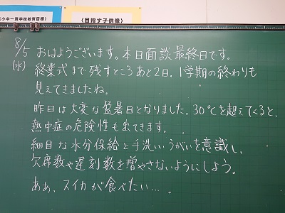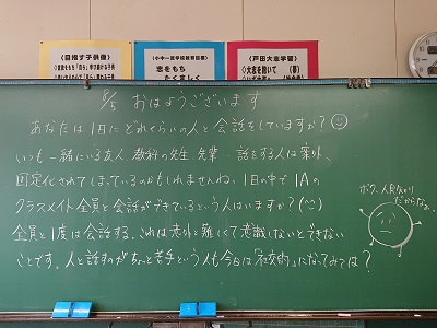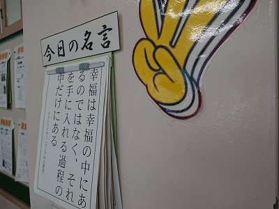 各クラスには、学級担任が思いを込めて用意した「黒板メッセージや今日の名言」が掲げられています。朝早くから学級担任が準備しています。