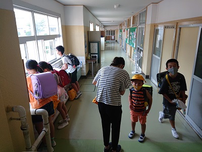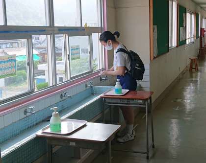 登校後には、小学生は1階で、中学生は3階に移動してまず手洗い・うがいのルーティーンがあります。