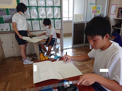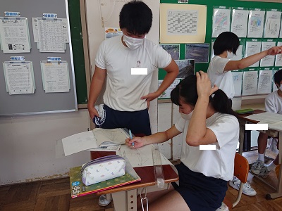 3年生は美術の時間に、1学期末テスト返却とテスト解説がありました。立体図形の書き方については、友達同士で確認する姿が見られました。