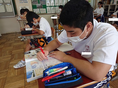 3年生は社会で「冷戦の開始と植民地の開放」という教材を学習しています。冷戦はどのようにして始まり、アジアにどのような影響を与えたのかを教科書や資料集から読み取り、分かったことを友達と確認しました。