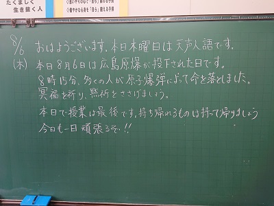 各クラスには、学級担任が思いを込めて用意した「黒板メッセージや今日の名言」が掲げられています。朝早くから学級担任が準備しています。