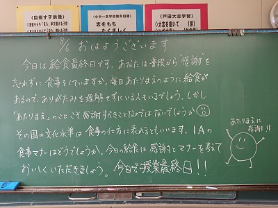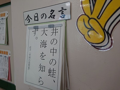 各クラスには、学級担任が思いを込めて用意した「黒板メッセージや今日の名言」が掲げられています。朝早くから学級担任が準備しています。