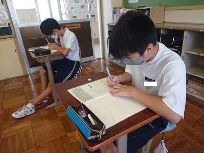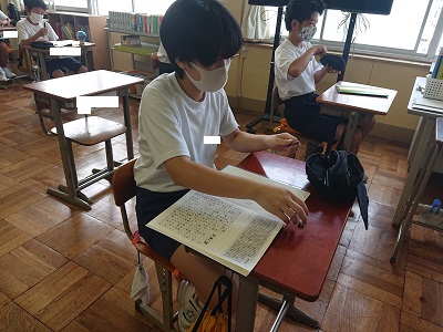 1年生の潮風タイムの様子です。全学年で「天声人語の視写」を行っています。みんな文章をじっくり読み、丁寧に書いています。