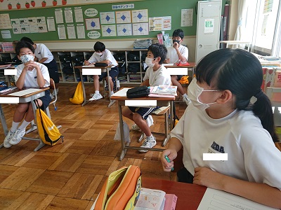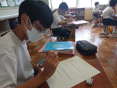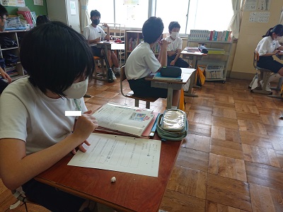 1年生は英語の時間でした。昨日、タブレットパソコンを使った英会話オンライン授業の振り返りを、シートに記入していました。