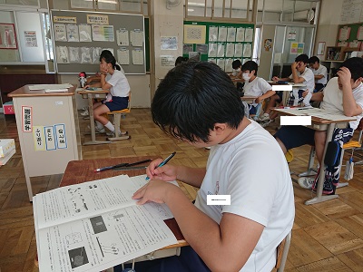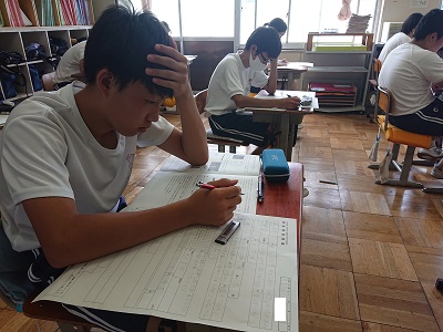 3年生は理科の時間に、9月に行われる静岡県学力診断調査に向けた対策問題を解いていました。