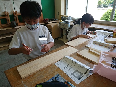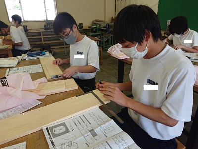1年生は技術で「材料と加工に関する技術」について学習しています。ラック制作に入りましたが、今日は材料取り(けがき)をしています。