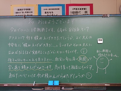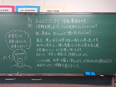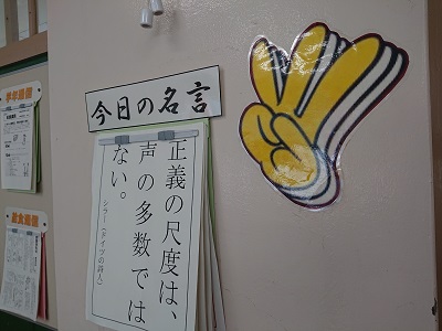 各クラスには、学級担任が思いを込めて用意した「黒板メッセージや今日の名言」が掲げられています。朝早くから学級担任が準備しています。