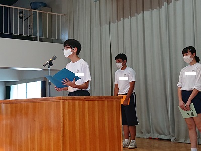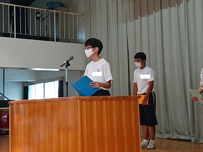 一つ目は「長い休校からの入学について」です。新型コロナウイルスの影響で入学がとても遅れてしまいました。その休校の間は、学校の時間に合わせて勉強を行って、普段学校でやる内容を家で学習するという不思議な感じがしました。さらに、母親が学校から新しい教科書を持ってきてくれたときには、その重さにとても驚きました。そして毎日の様に家で勉強する間、「みんなは何をしているのかな」や「学校に行きたいな」など、ずっと思っていました。そして6月に学校が再開されました。今までには無かった登校時間の制限や、健康観察カードの提出、手洗いの徹底などに戸惑いながらも、だんだんと学校生活に慣れることができました。しかし、「最近その対策がおろそかになってきているので、注意していきたい」と思っています。
