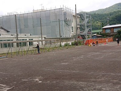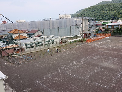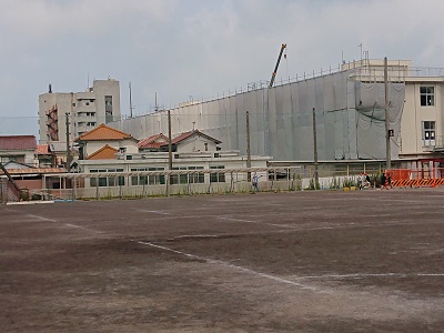 本日、給食センター東側の仮囲いが撤去されました。9月の小中合同運動会には、昨年同様のトラックをつくり、競技ができるようになります。