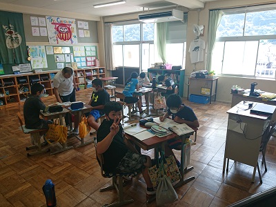 小学6年生の教室では、社会の学習でグループ活動を行っていました。5年生の教室掲示には、「深海の世界」が飾られています。
