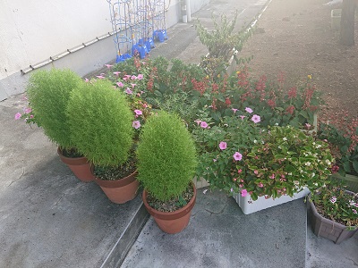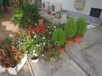 玄関の様子です。玄関前には「戸田花の会」の皆様からいただいたホウキ草やペチュニア、ベコニア等がきれいに咲いています。