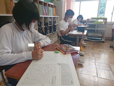 2年生の潮風タイムの様子です。全学年で「天声こども語の視写」を行っています。みんな文章をじっくり読み、丁寧に書いています。