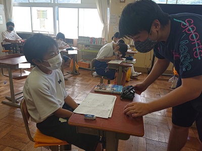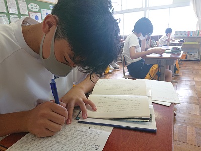1年生は国語で「読書感想文コンクール」にチャレンジしています。それぞれが選んだ本を読み取り、原稿用紙に感想を書いていました。