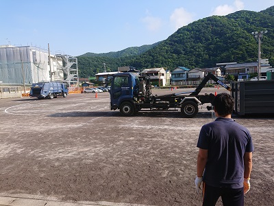 古紙回収業者のトラックが到着し、作業が開始しました。