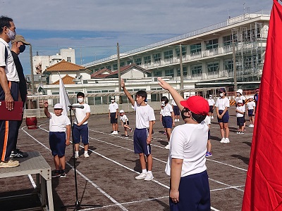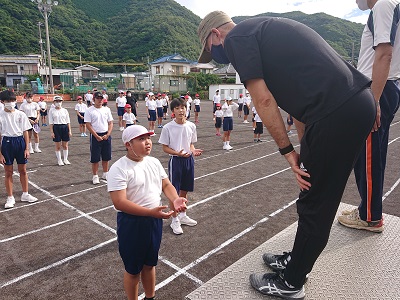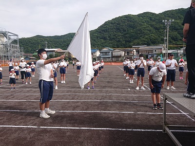 小中学生が開会式と閉会式の練習をしました。優勝旗返還や授与、選手宣誓など、丁寧に行いました。