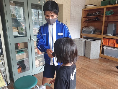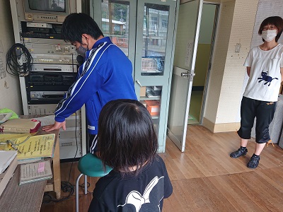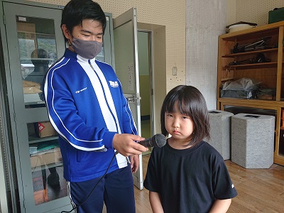 放送委員会では、小中合同運動会に向けて、児童生徒に意気込みや目標を聞く企画を行っています。中学生が小学生にインタビューしていました。