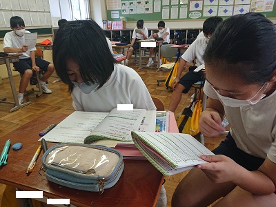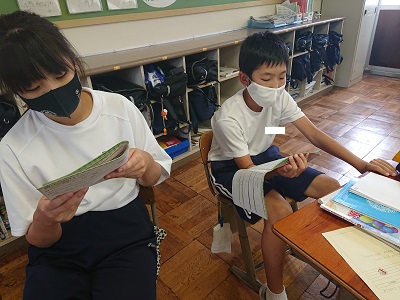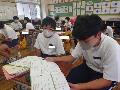 1年生は英語で「英語の質問に英語で答えよう」という学習を行っています。ペアになり、既習事項の英文を何度も読んでいました。