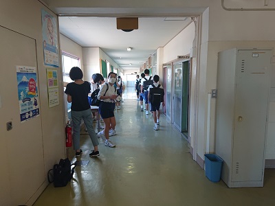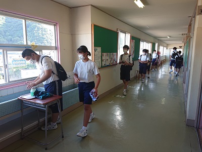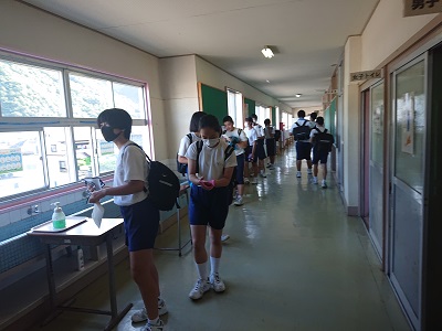 登校した児童生徒は、必ずうがい、手洗いを行ってから教室に入ります。登校後のルーティーンです。教員も生徒の様子を見守っています。