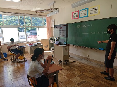 3年生は言語科「英語の時間」において、ALTのグレッグ先生と一緒に「〇〇 made me (happy).」を使った文章作りを行いました。