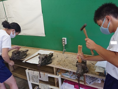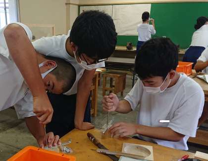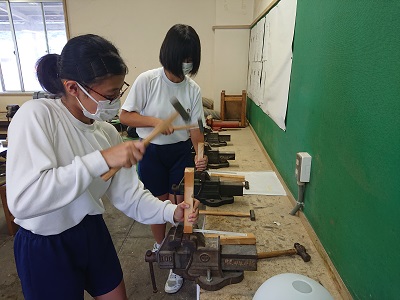 2年生は技術でドーム調光スタンド作成を行っています。今日は、木製台の組み立てとアルミ棒の加工をしました。みんな丁寧に作業をしています。