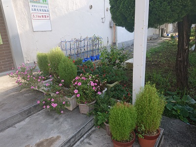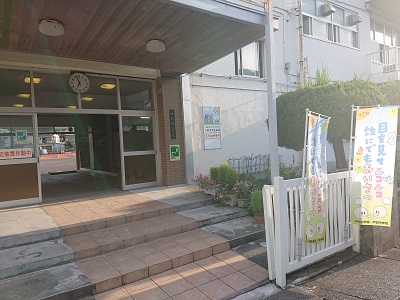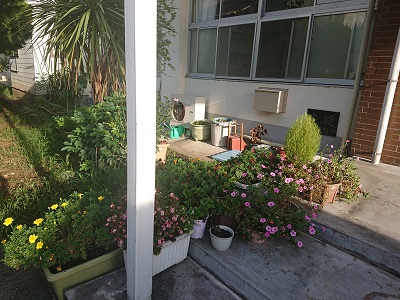 玄関の様子です。玄関前には「戸田花の会」の皆様からいただいたホウキ草やペチュニア、ベコニア等がきれいに咲いています。