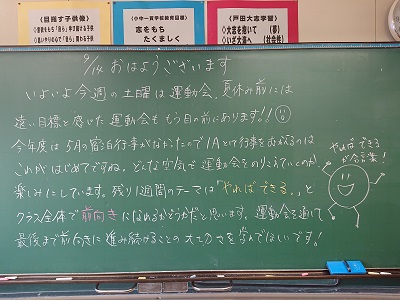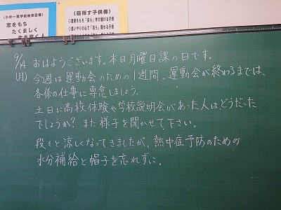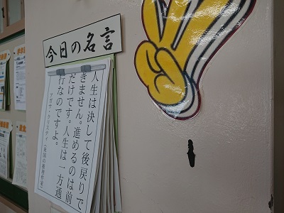 各クラスには、学級担任が思いを込めて用意した「黒板メッセージや今日の名言」が掲げられています。朝早くから学級担任が準備しています。