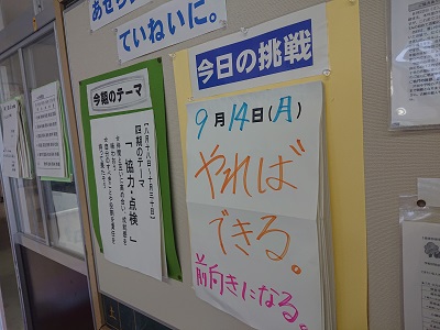 1年生教室の学級掲示です。「やればできる」という気持ちで、挑戦する一日としていきます。
