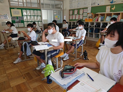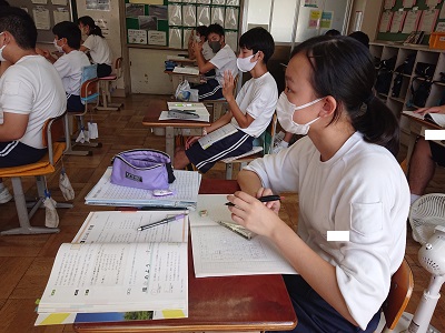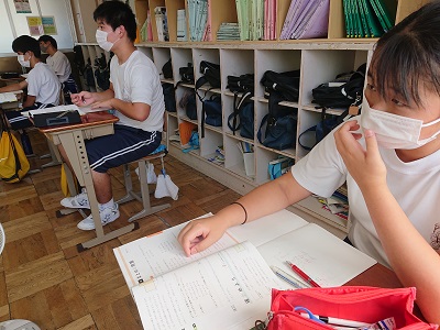 3年生は数学で「2次方程式」の学習をしています。「正方形の面積の和は52平方センチメートルなるのは、一辺が何センチメートルのときか」という問題を解き、皆で立式の仕方を共有しました。