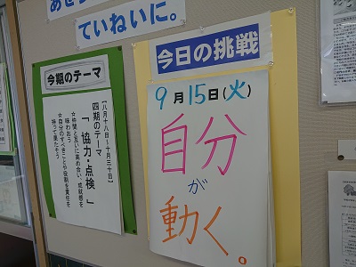 1年生教室の学級掲示です。「自分が動く」という気持ちで、挑戦する一日としていきます。