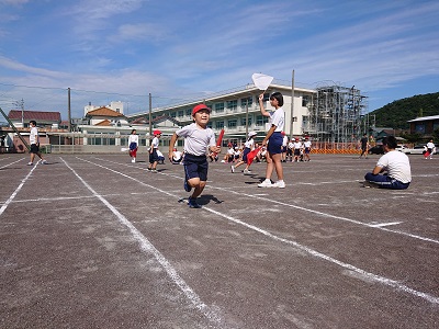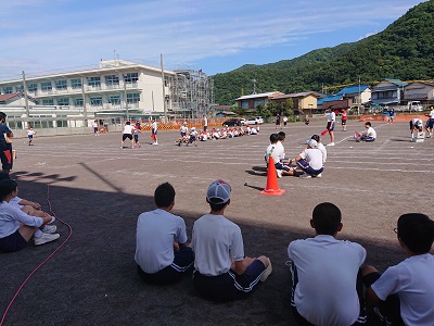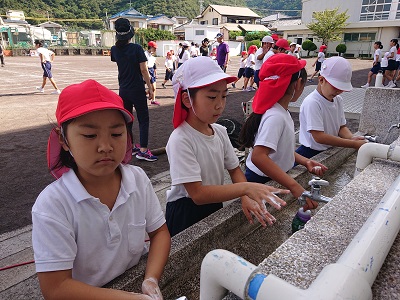 小学生が競技している時は、中学生は係活動をしたり、日陰で応援したりしています。競技が終わると手洗いを行いました。