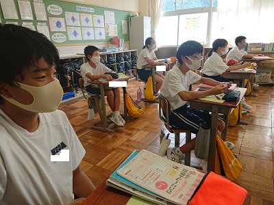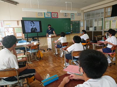 1年生は英語で「英語の質問に英語で答えよう」という学習を行っています。大型提示装置を使って、既習事項の確認をしていました。