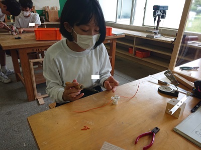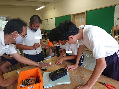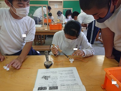 2年生は技術でドーム調光スタンド作成を行っています。今日は、はんだを使って金属の接合を行いました。